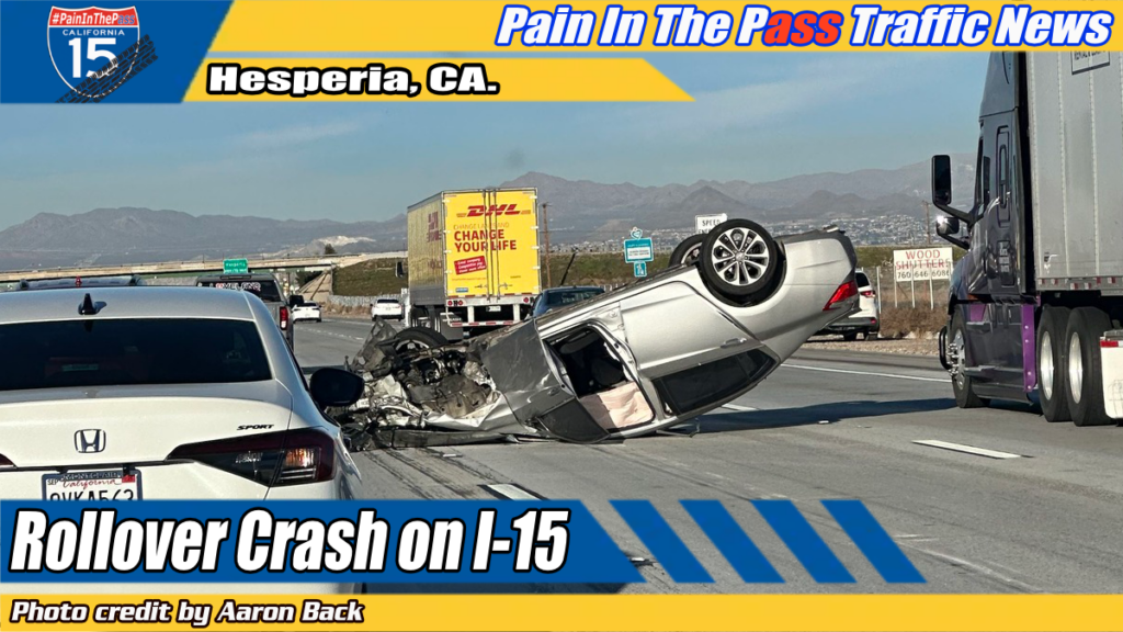 HESPERIA, CA. (Pain In The Pass) >> A car overturned after a two-vehicle crash Sunday afternoon on Interstate 15. California Highway Patrol Officers responded to the area of northbound I-15