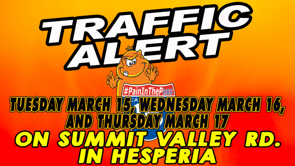 HESPERIA, CA. (Pain In The Pass) >>Update they have postponed roadwork on Tuesday March 15, Wednesday March 16, and Thursday March 17, 2022 on Summit Valley Road between 8am and