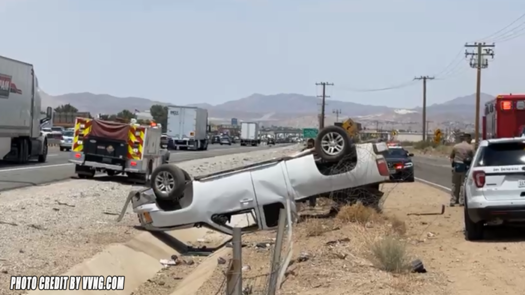 HESPERIA, CA. (Pain In The Pass) >> One person was injured in a crash Tuesday afternoon in which a pickup truck rolled over onto its roof off of Interstate 15