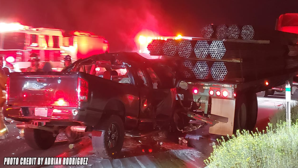 PHELAN, CA. (Pain In The Pass) >> A male driver had serious injuries after his truck became wedged underneath a semi tractor-trailer on northbound Highway 138 Sunday night. According to