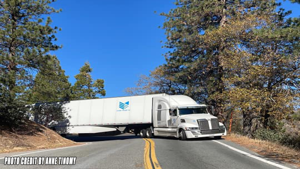 CRESTLINE, CA. (Pain In The Pass) >> Semi become stuck on a hairpin turn on Highway 138 Monday morning. The California Highway Patrol said Highway 138 was blocked at Burnt