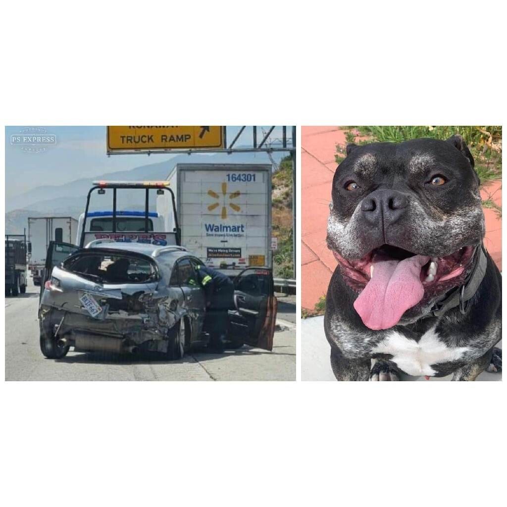 CAJON PASS, CA. (Pain In The Pass) >> Bandit, an 8 month old female black pit bull who jumped out from a vehicle Saturday during a crash. The Crash happened