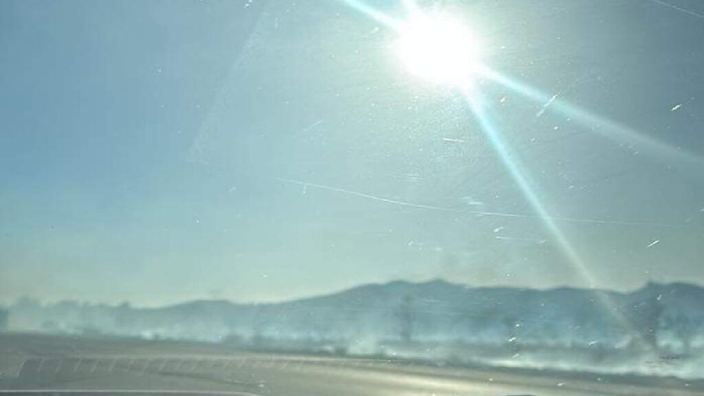 MOUTAIN PASS, CA. Pain In The Pass) >> A fast-moving brush fire burned next to Interstate 15 Saturday morning, sparked by a vehicle fire. (Photo above is credit by Jeffrey