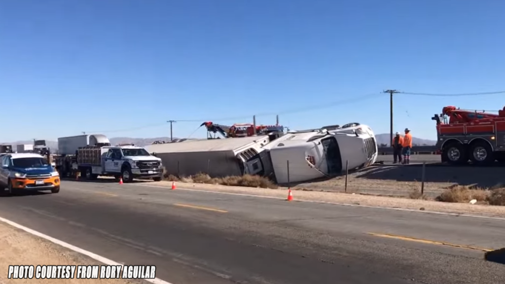 VICTORVILLE, CA. (Pain In The Pass) >> A big rig overturned after its driver fell asleep on Interstate 15 in Victorville, one southbound lane was blocked and traffic was backed