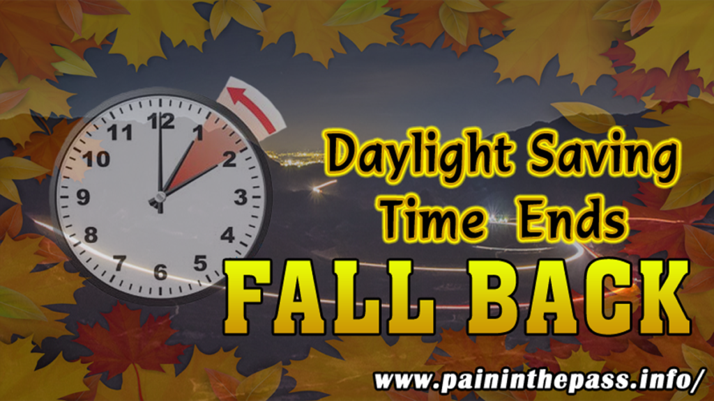 SOUTHERN CALIFORNIA, CA. (Pain In The Pass) >> Don’t forget that Daylight Saving Time ends tonight. Remember to turn those clocks back one hour. The change will happen on Sunday